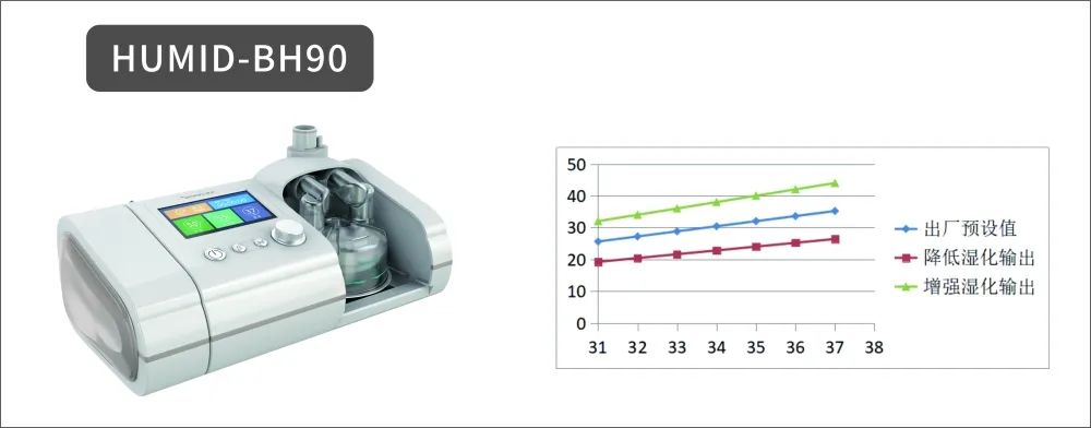 當(dāng)?shù)土髁繜o法滿足患者氧療需求時,臨床通常會使用高流量的氧療設(shè)備進(jìn)行呼吸支持。近年來國際上應(yīng)用較為廣泛的高流量氧療設(shè)備是高流量呼吸濕化治療儀:通過無需密封的鼻塞導(dǎo)管輸送充分加溫加濕的濃度可設(shè)置(21%-100%)的高流量(高達(dá)90L/min)氣體的氧療方式。它提供的氣體流量≥患者吸氣峰流量,滿足患者氣體吸入量的需要,精準(zhǔn)輸送設(shè)置的氧濃度(21%-100%),可以快速有效的改善氧合。同時,HUMID-BH系列可以對患者吸入空氧混合后的氣體進(jìn)行29-37℃逐度的加溫加濕調(diào)節(jié),減輕呼吸道濕化的負(fù)荷,達(dá)到BTPS狀態(tài)。并且可根據(jù)患者的舒適度和耐受度,以及痰液黏稠度不同,進(jìn)行濕化輸出飽和度(-3~+3)7檔微量調(diào)節(jié),使患者的氣道進(jìn)行充分的溫濕化,接近飽和濕度。幫助保護(hù)維持患者正常的氣道黏膜的功能。